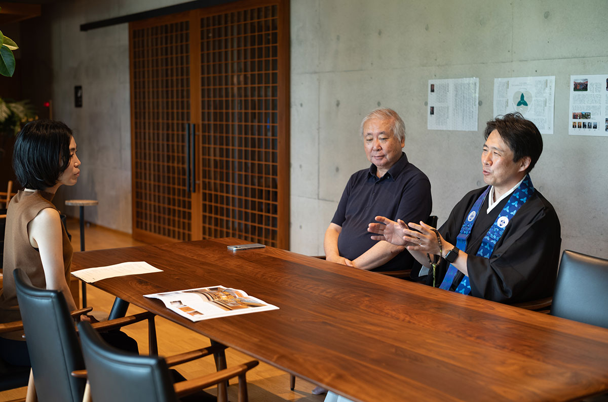信純さん:「本堂の設計を進める前に、東京や京都など各地のお寺を視察しました。その中で感じたのは、暑さ・寒さへの対策やバリアフリーへの配慮も重要ですが、自然に人が集いたくなるような雰囲気です。そんな折、北九州で古森弘一建築設計事務所が手掛けた納骨堂を見学する機会がありました。その建物はとても印象的で、実際にお会いした古森さんの考え方にも強く共感できました。古森さんはそれまでいくつかの納骨堂を手掛けていらっしゃいましたが、RC(鉄筋コンクリート)造の本堂設計は初めてでした。でも私たちはコンセプトだけを伝えて、あとは思いきり挑戦してください、とお願いしたのです。予算は厳しかったのですが、素晴らしいプランを描いていただきました」。