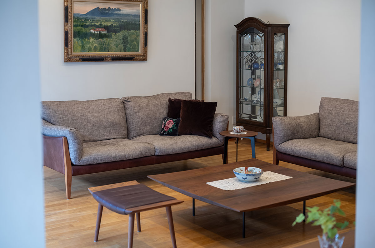 旦那様:「ショールームで実際に家具に触れて、すごくしっくりきたんです。応接間はシックにして、ダイニングは明るい色味にして雰囲気の切り替えもできました。素材や色を選ぶことで、対応できるところも良いですよね」。