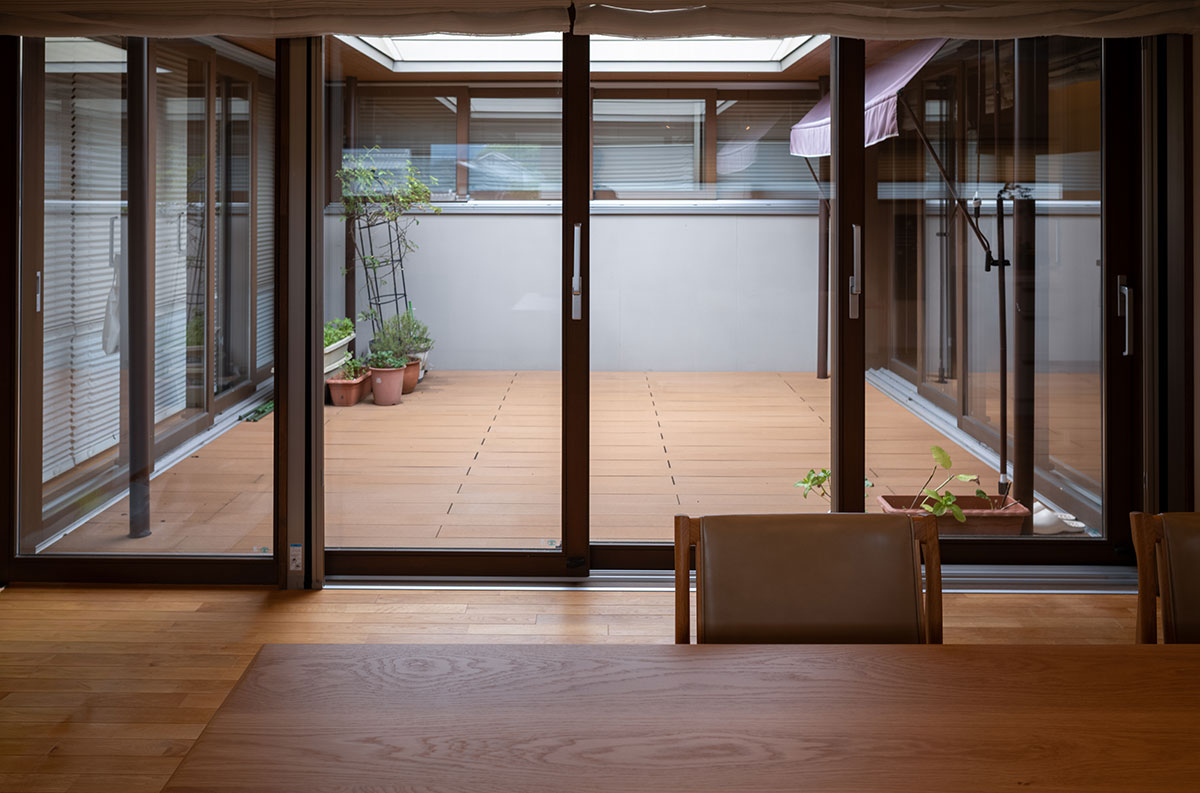 中庭はお子様が小さい頃はプールで遊んだり、コロナ禍にはテントを張ってキャンプをしたりしたそうだ。プライバシーが守られている気兼ねのない空間。中庭は医院併用住宅ならではの課題を解決するのだ。