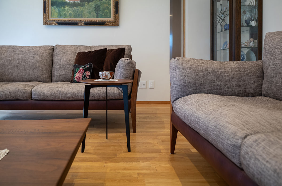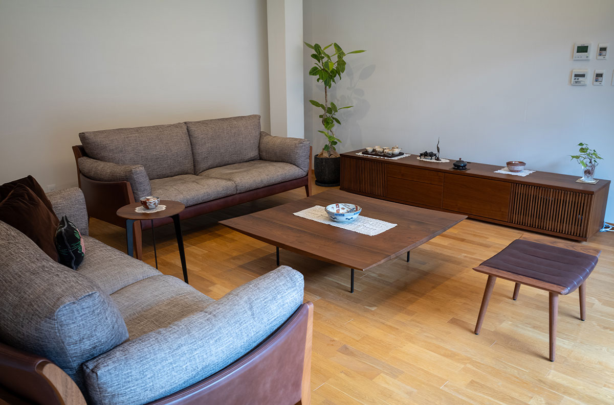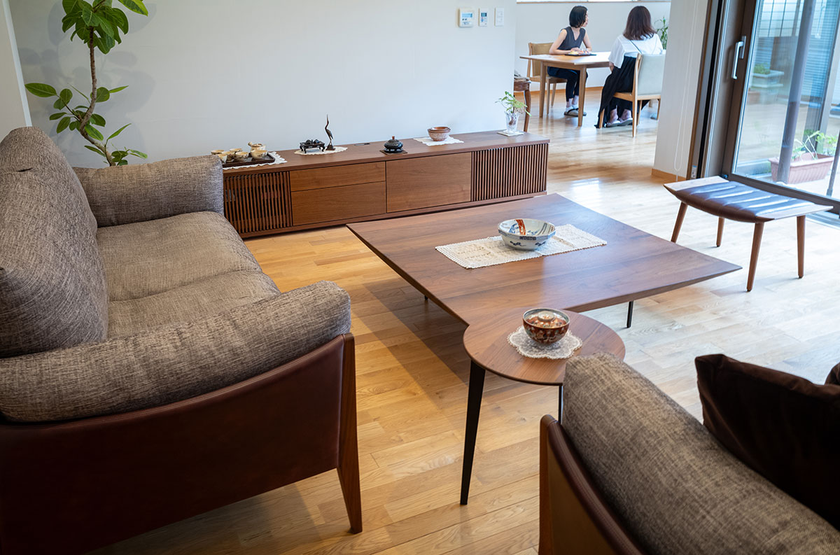 最初に購入したのはDIANAソファとUNO TVボード。IBIZA FORTEリビングテーブルはソファに合わせてその後購入した。応接間の家具はウォールナットで統一し、落ち着いた色調に。石田様ご夫婦は新居の完成後、少しずつ家具を揃えていった。