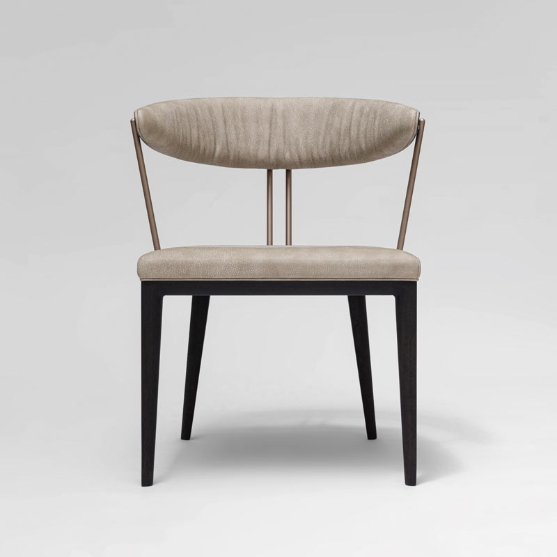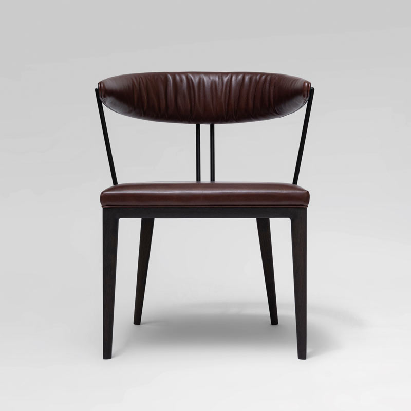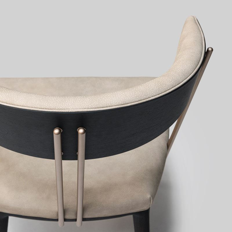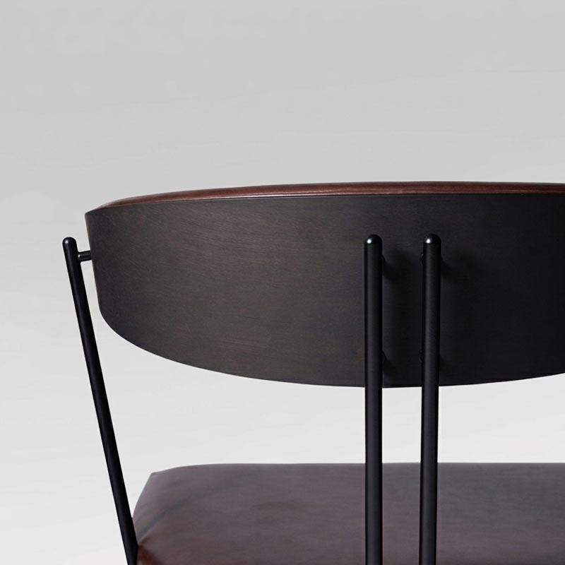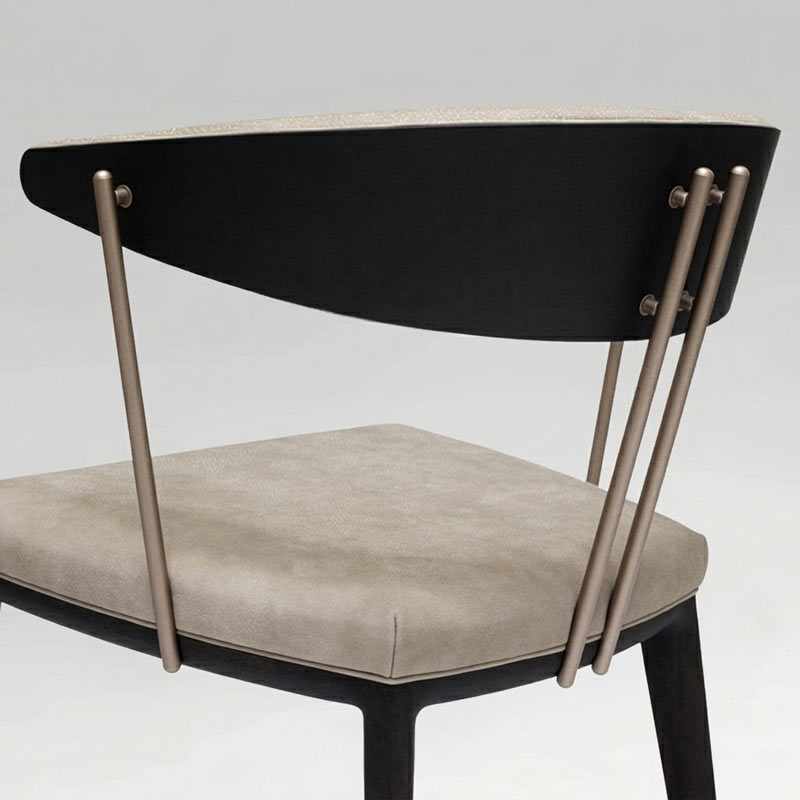 Step forward, and the physical reality of the armchair emerges. Bare steel rods carry the weight, allowing the upholstered backrest and the wooden frame to appear almost weightless. Architectural poise unites contrasting materials into profound balance.