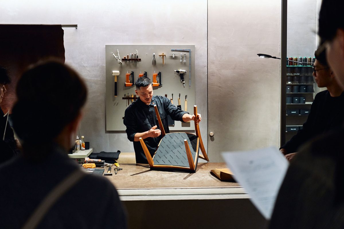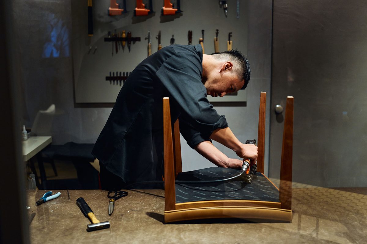2024年春に実施した第一弾「オイルメンテナンスセミナー」では、日頃からお客様が気にされている疑問や不安を解消するため、日常の使用環境を想定した内容で、オイルフィニッシュのテーブルのお手入れを実施。実際に家具が美しく蘇っていく様子を間近でご覧いただきながら、「どのような状態が理想なのか」という家具本来の姿も確認していただきました。このたび、その メンテナンスセミナー第二弾 として、アンケートでもご要望の多かった張替えの舞台裏を、職人の解説とともに特別に公開しました。