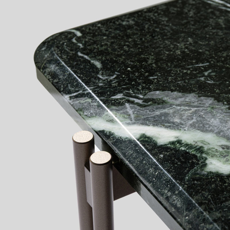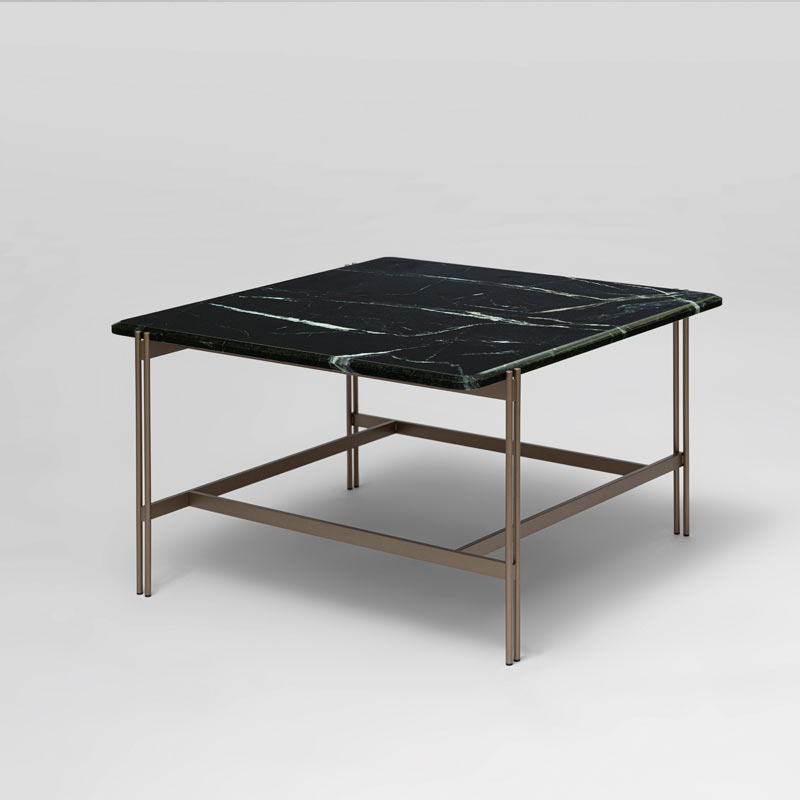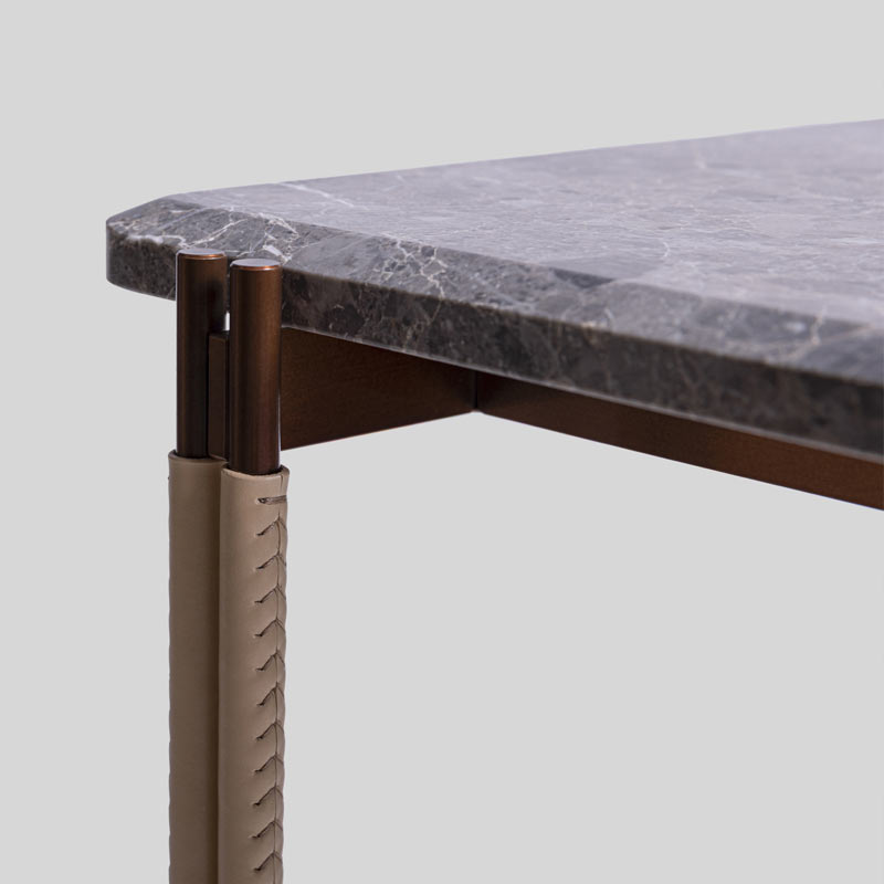 Observe the base. Steel legs intersect in deliberate asymmetry, forming a visual illusion that shifts with your perspective. Whether taking the form of a sprawling lounge table, an intimate coffee table, or a quiet side table, the frame anchors the interior, asking you to slow down.